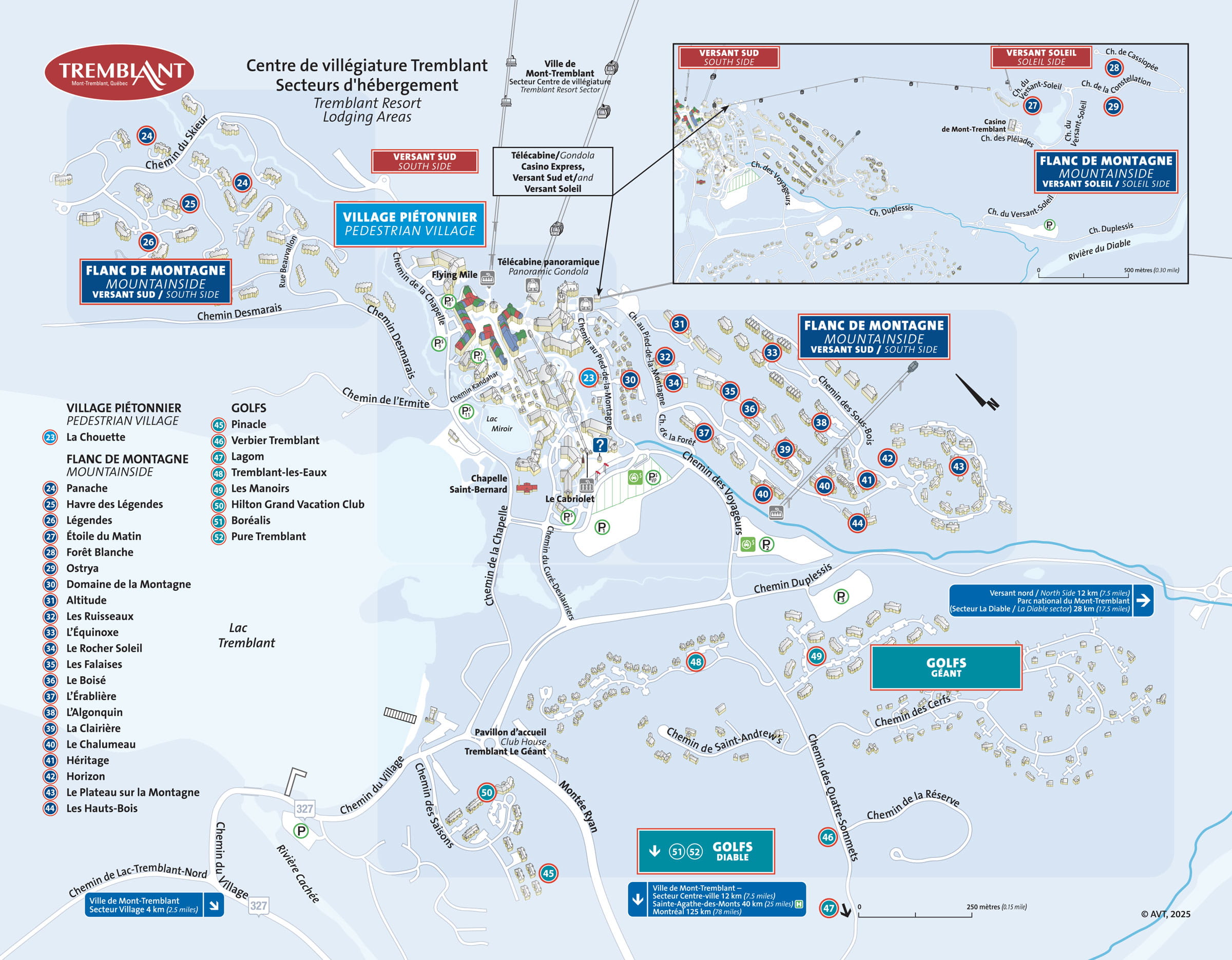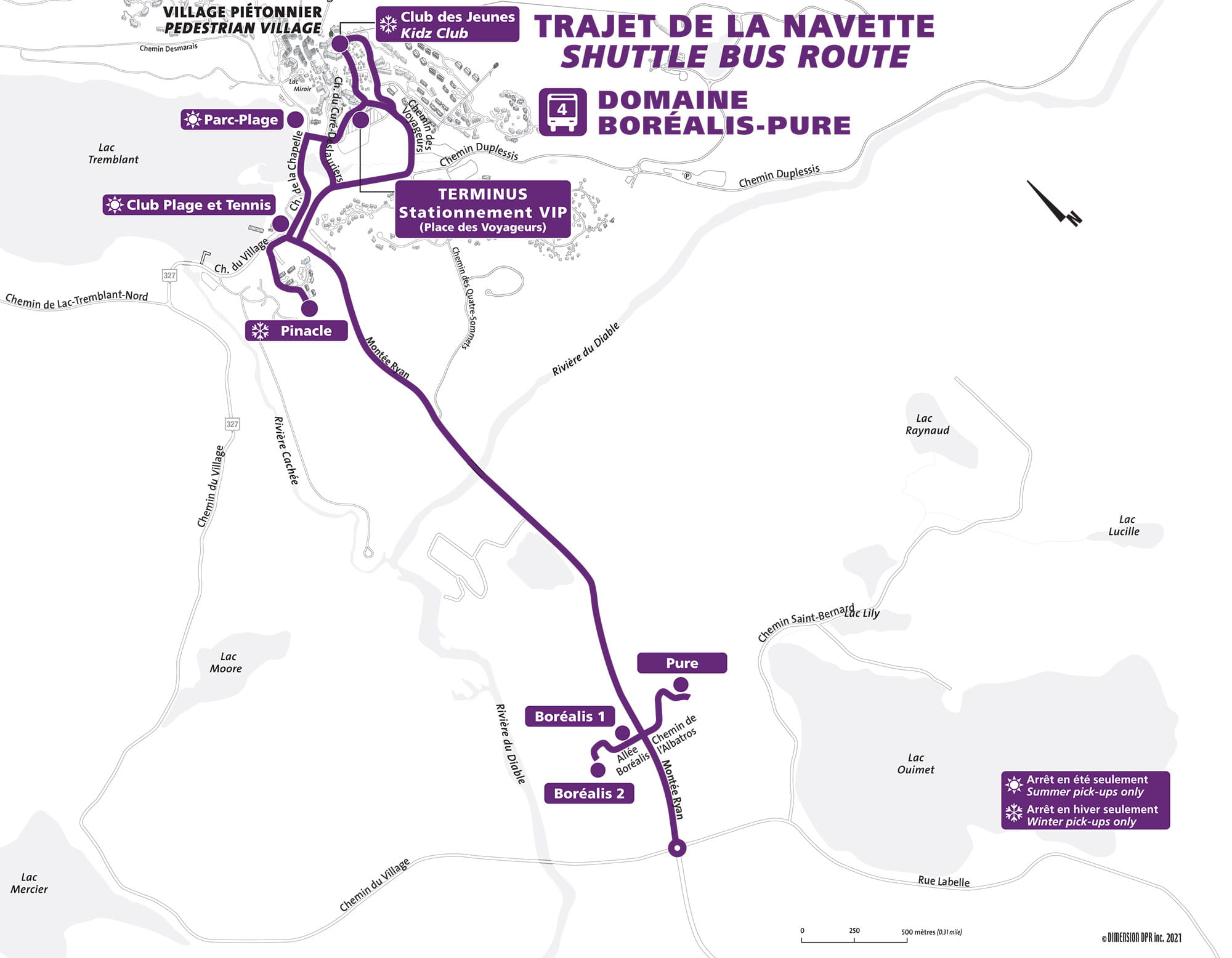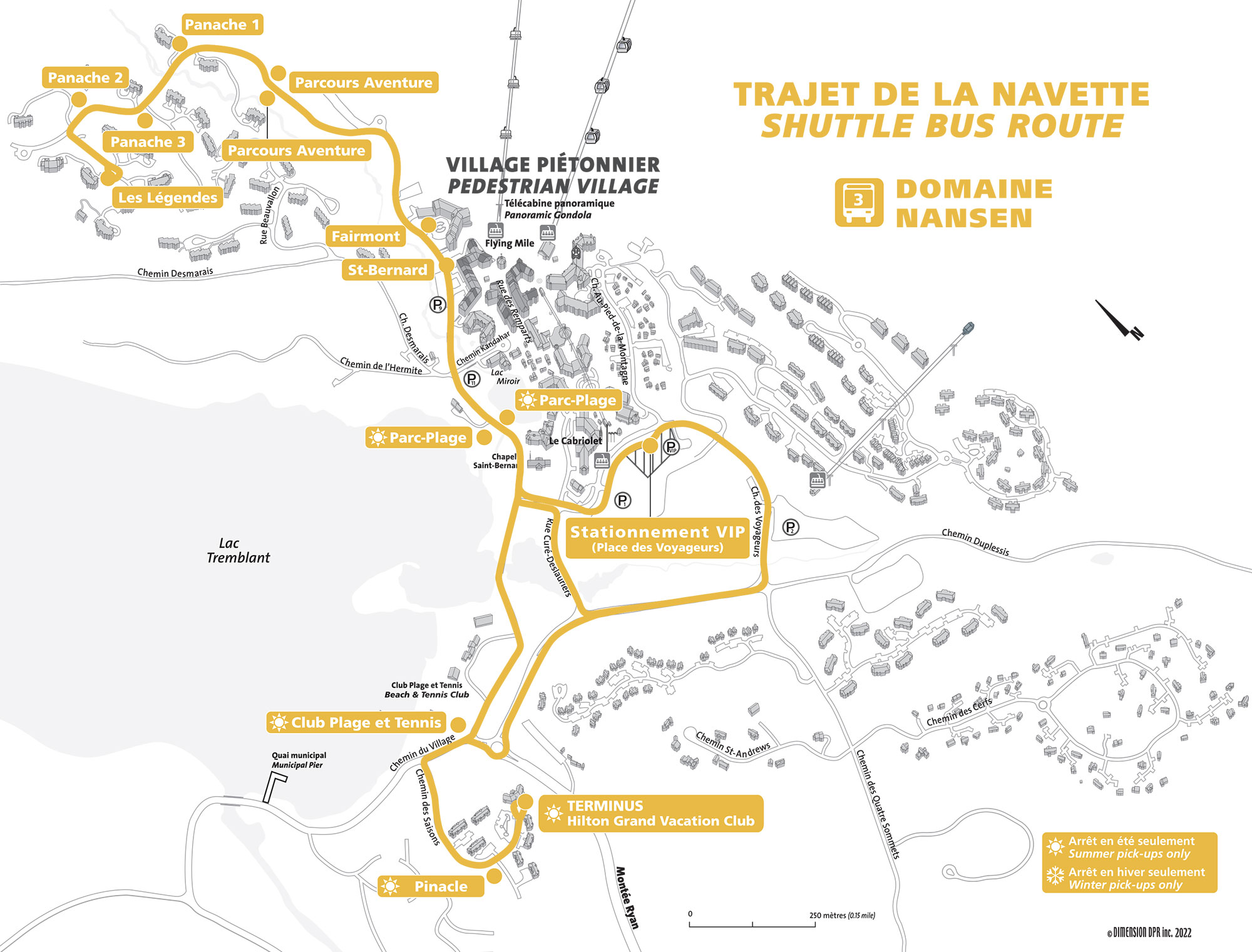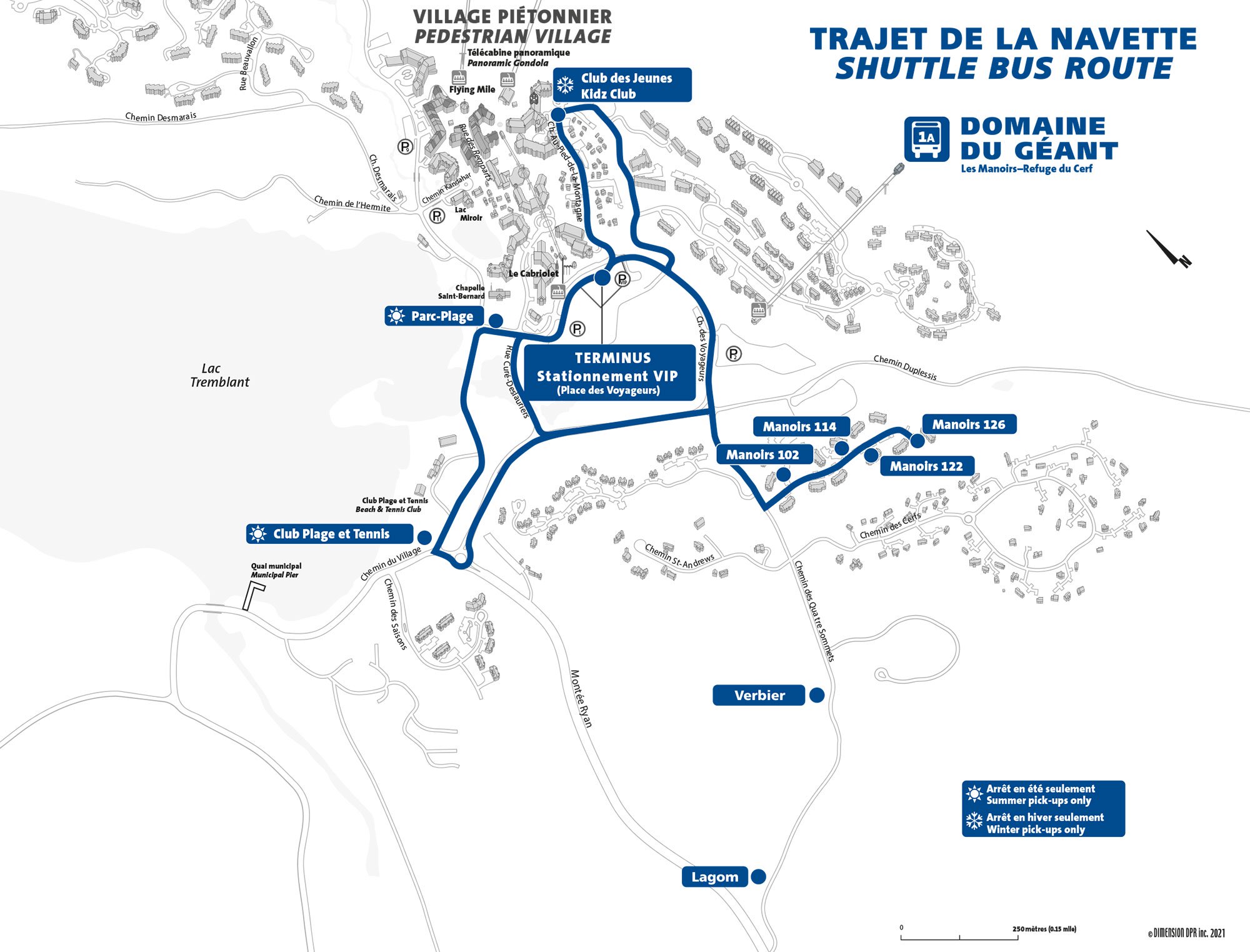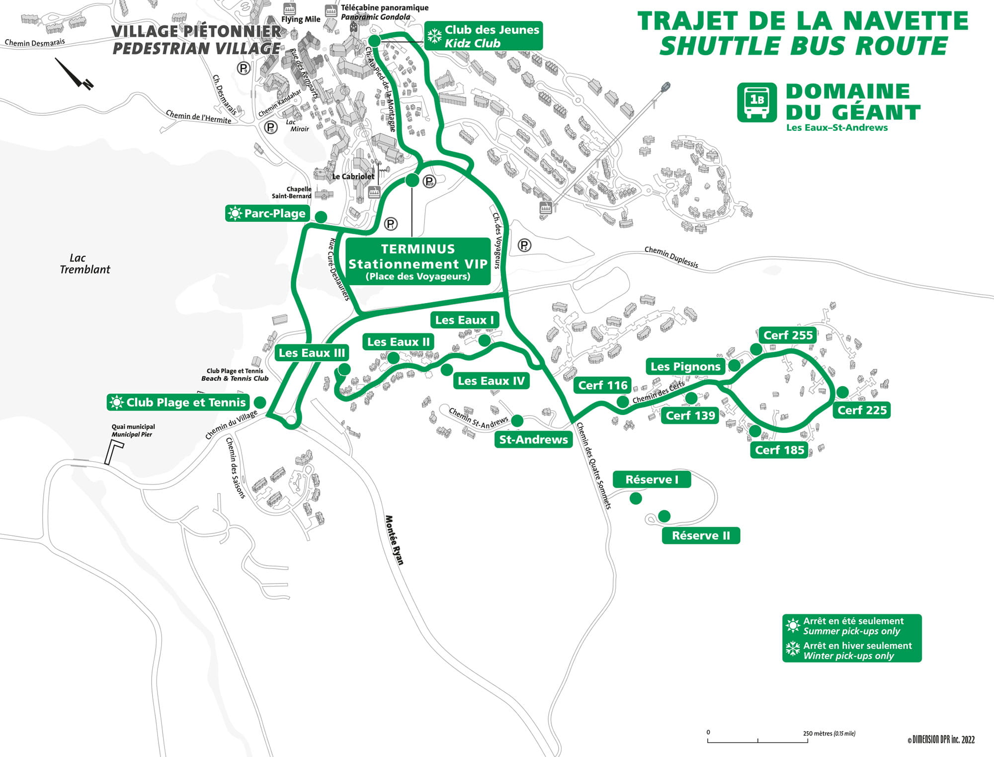 A complimentary shuttle service connects your accommodations to Tremblant’s pedestrian village, courtesy of the Tremblant Resort Association. Check the routes below or get more information at the Info Mont-Tremblant Welcome Centre, Guest Services or your vacation rental reception.